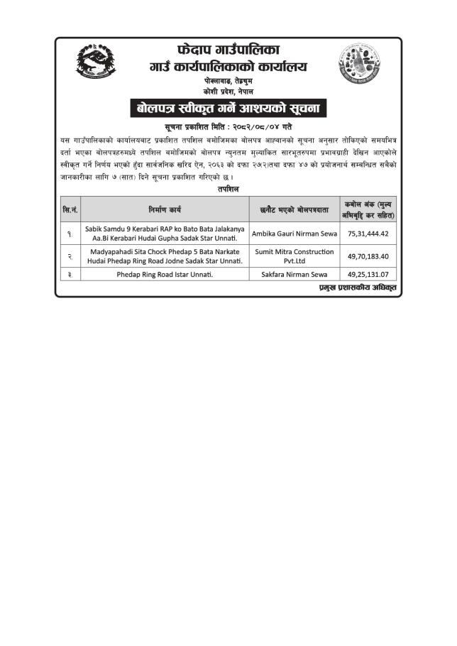 बोलपत्र स्वीकृत गर्ने आशयको सूचना ।