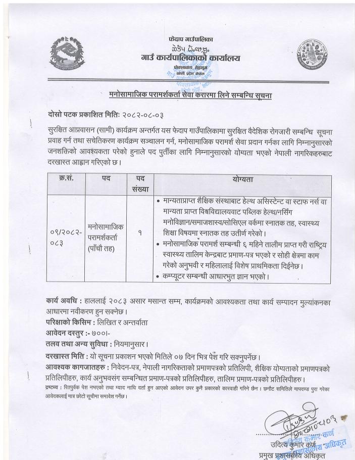 मनोसामाजिक परामर्शकर्ता सेवा करारमा लिने सम्बन्धी सूचना ।