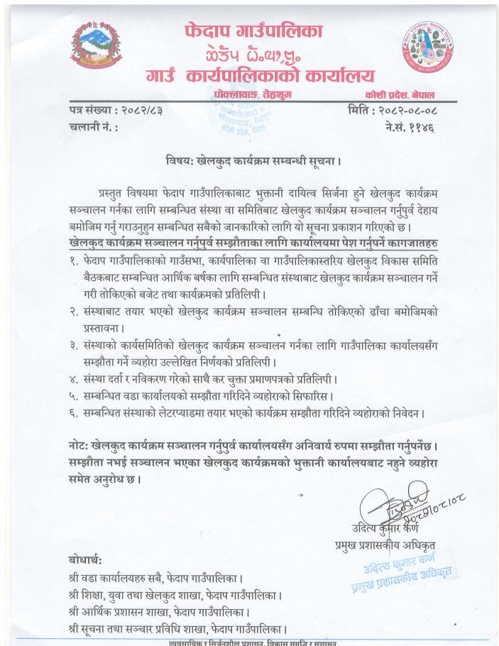 खेलकुद कार्यक्रम सम्बन्धी सूचना ।