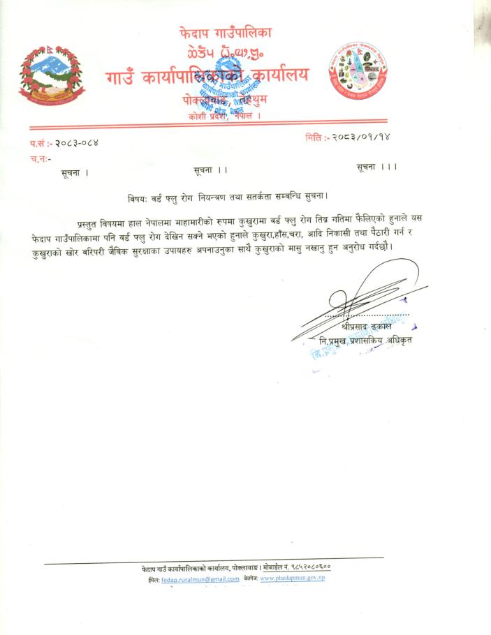 बर्ड फ्लू रोग नियन्त्रण तथा सतर्कता सम्बन्धि सूचना ।।