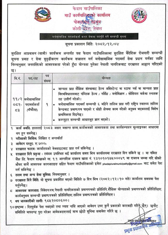 मनोसामाजिक परामर्शकर्ता करार सेवामा पदपूर्ति गर्ने सम्बन्धि सूचना ।