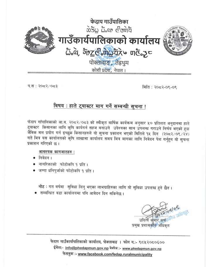 हाते ट्‍याक्टर माग गर्ने सम्बन्धी सूचना ।